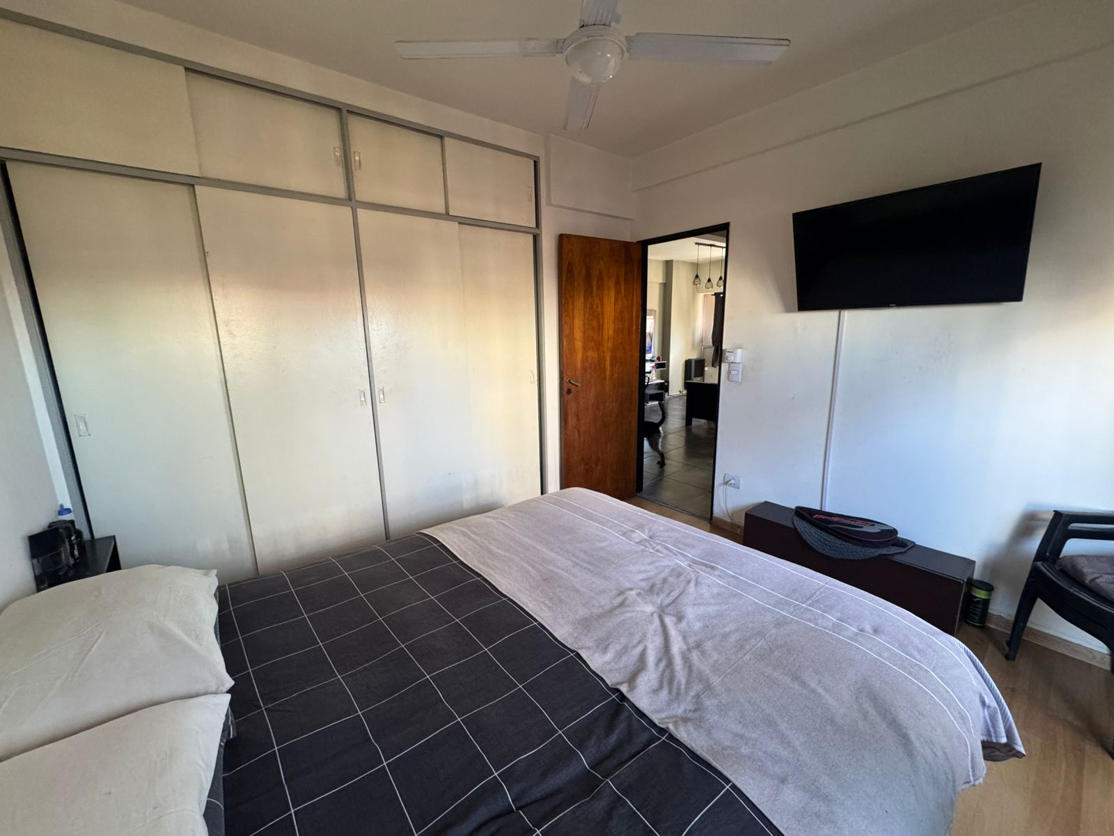Dormitorio principal con placard de piso a techo con interiores, ventilador de techo, piso flotante.